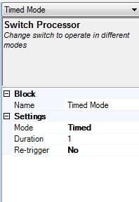 There are two switches (in my case both connected to an EnsembleConnect) – one is for the student and the other is for the teacher. The pupil switch goes into a Switch Processor block set to Timed Mode. This helps get rid of any false triggering by making the switch ignore any subsequent presses for the number of seconds set on the block.
